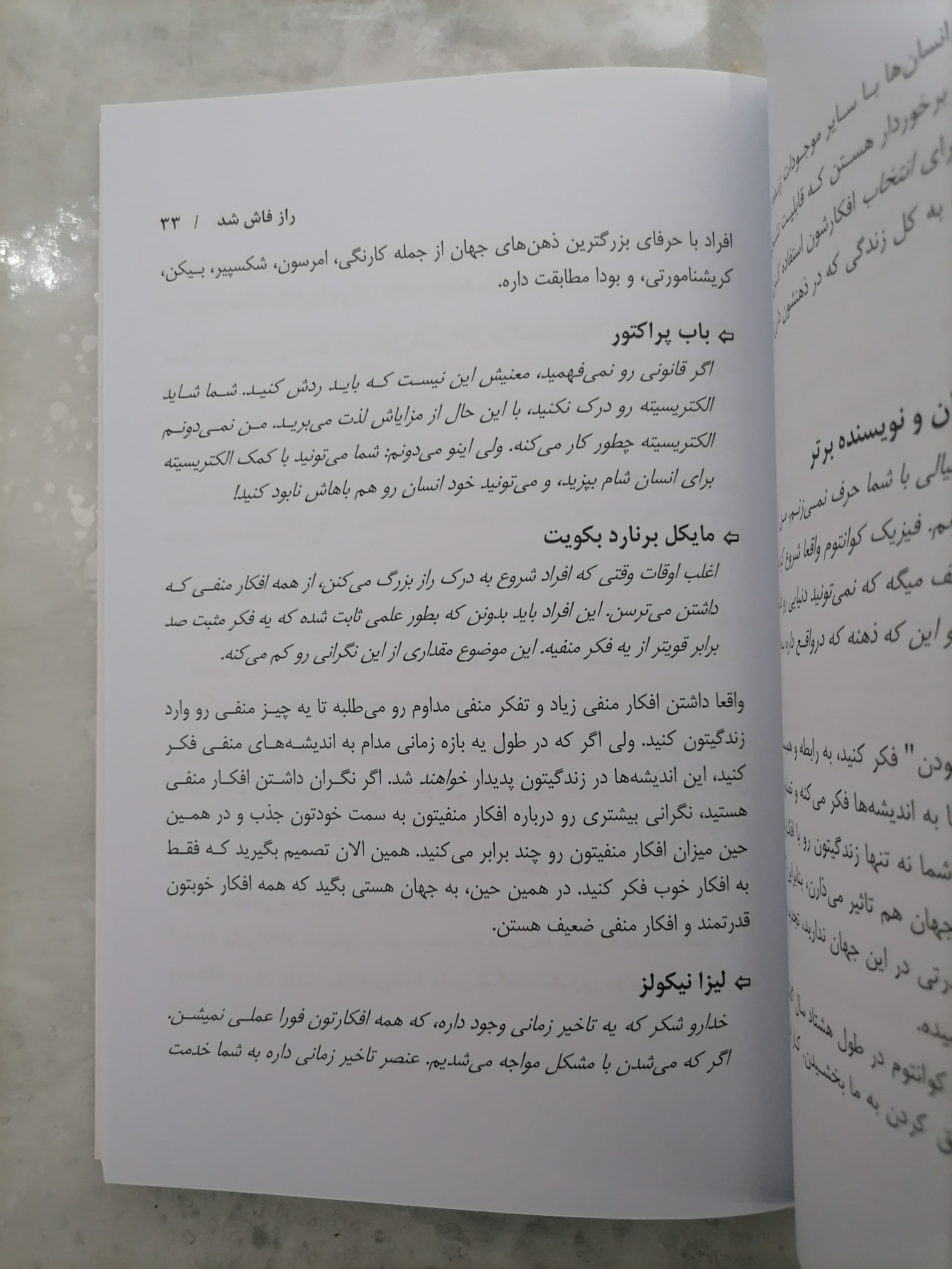 راندا برن در این کتاب پرده از اصلی برمیدارد که به گفته خودش در طول تاریخ، افراد موفق و ثروتمند آن را میدانستند و به کار میبردند